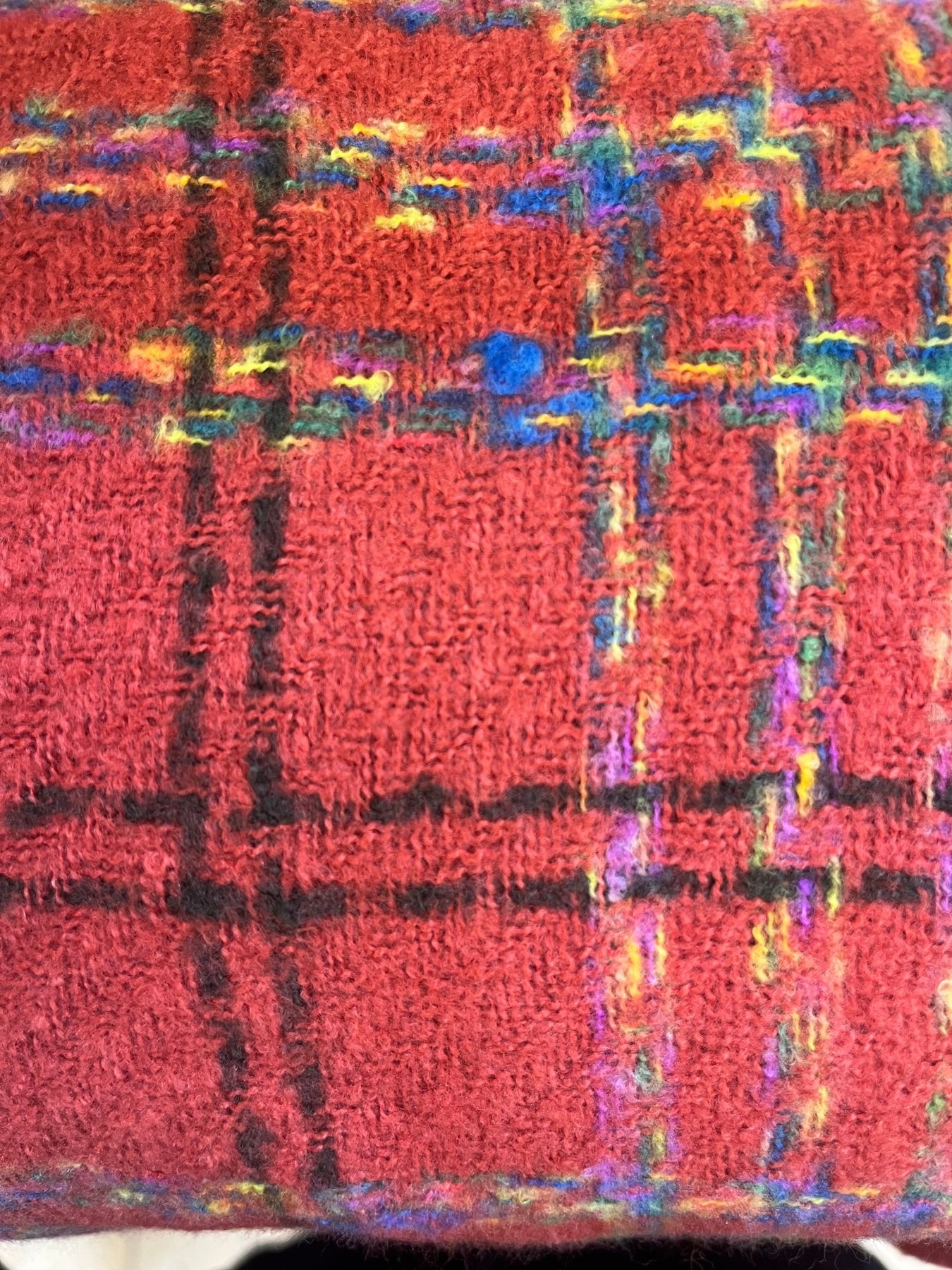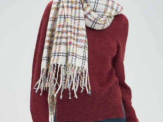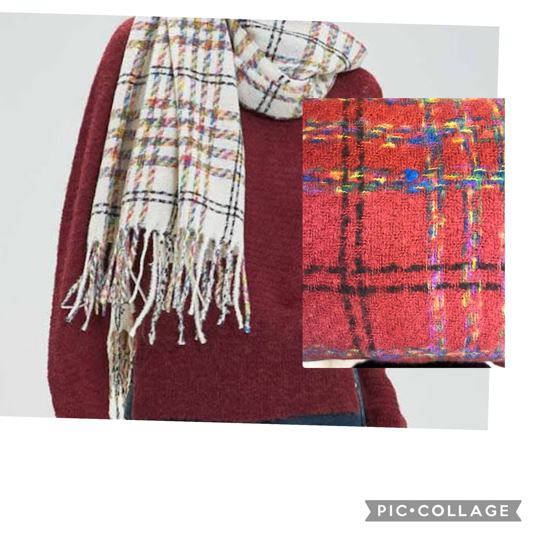 This gorgeous soft scarf comes in a beautiful burnt orange colourway with multicoloured check style design throughout.