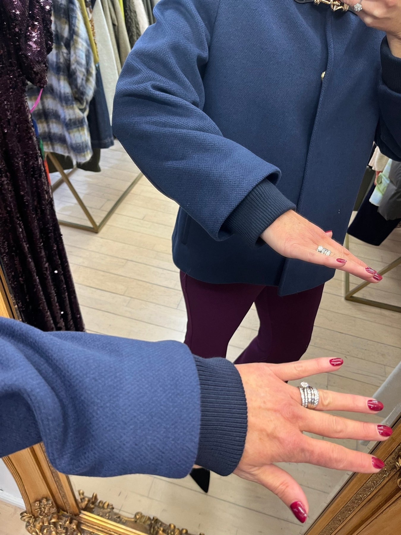 A nod to the Duffle coat this gorgeous short blue jacket by Fly girl has a contrasting material collar,stunning yet simple metal work opening to the top and two side pockets.