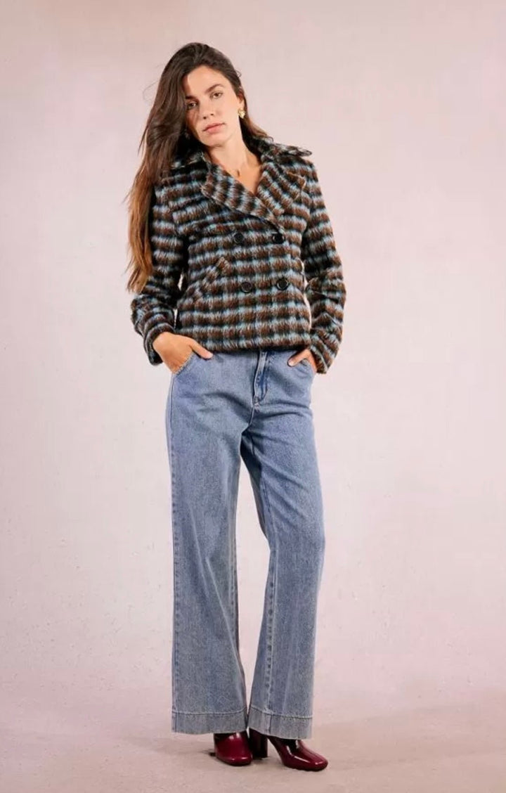 Textured plaid coat -Short cut -Long sleeves -Wide tailored collar -Double-breasted closure on the middle front -Side pockets -Double -Length from the shoulder 56cm for a size S"