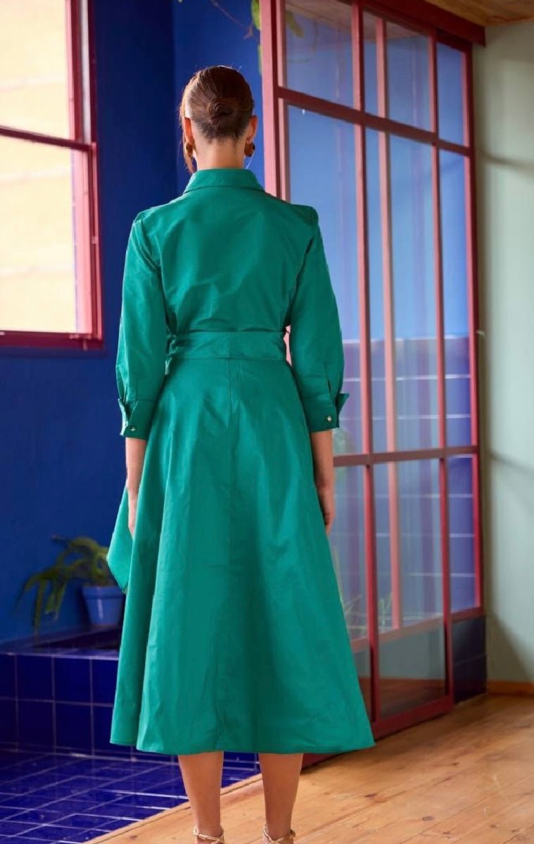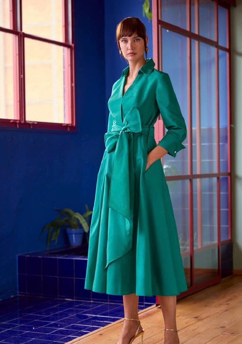 This midi dress in Lilac stands out for its sophisticated and timeless design. In a deep, luminous green, it features a shirt-style bodice that flatters the neckline and a large front bow that accentuates the waist for a very flattering effect. Its flowing skirt adds movement and elegance with every step, while the three-quarter sleeves and side pockets provide comfort and a touch of sophistication. Ideal for guests seeking a refined, modern, and flattering look.