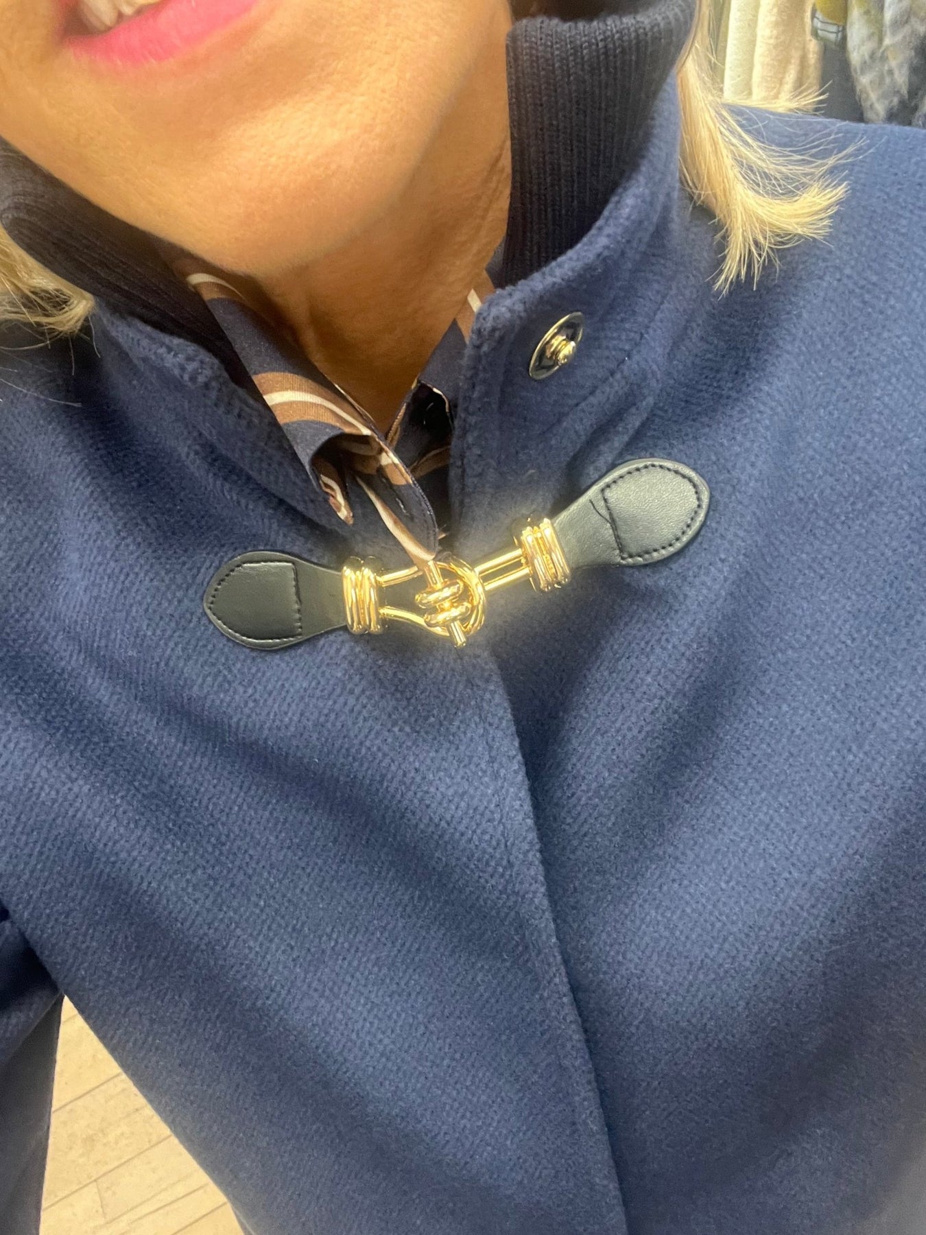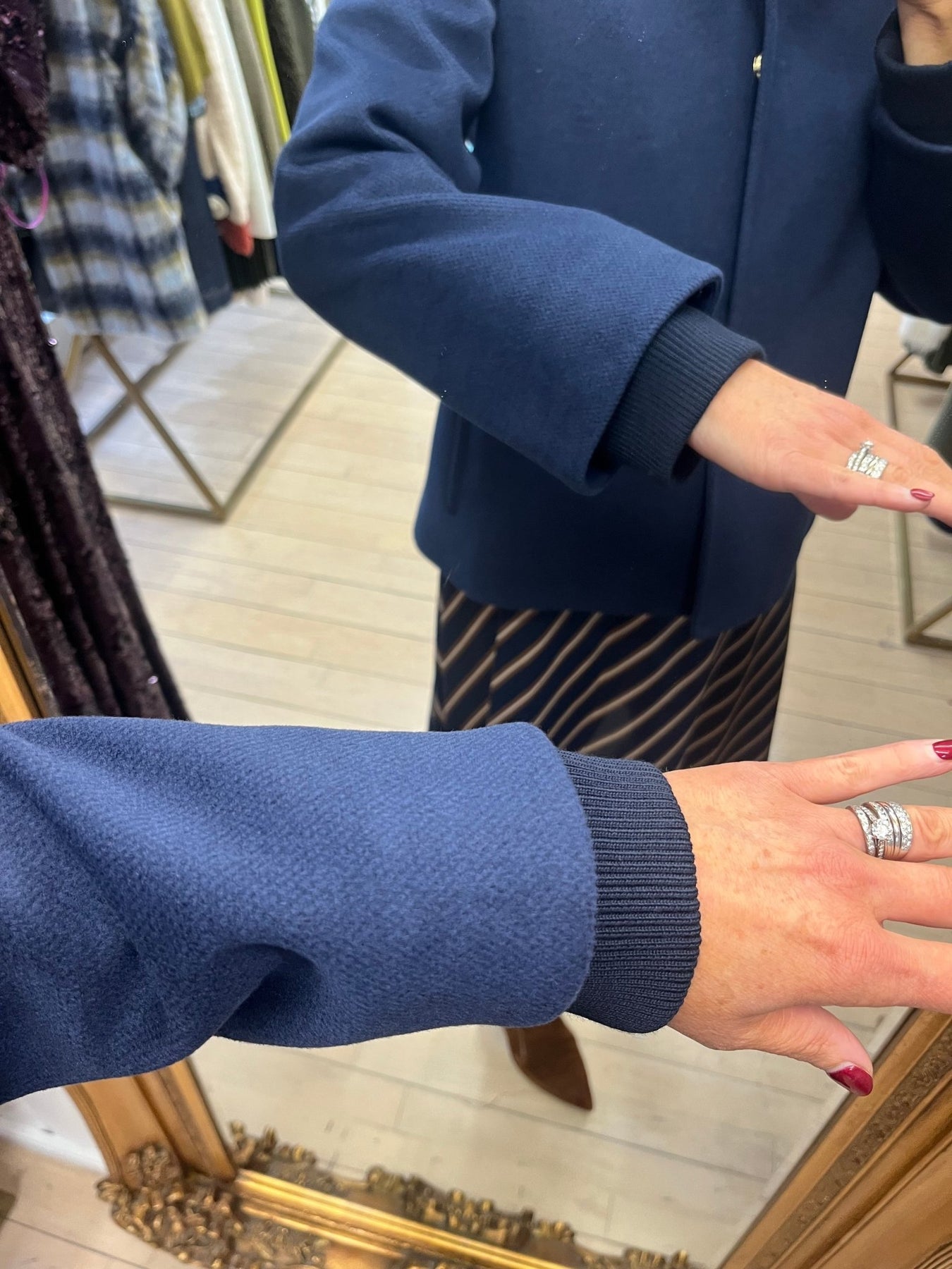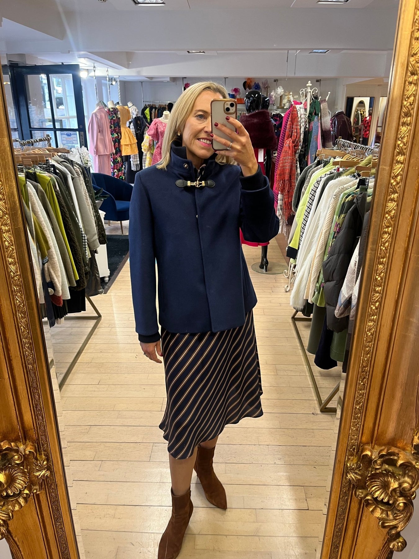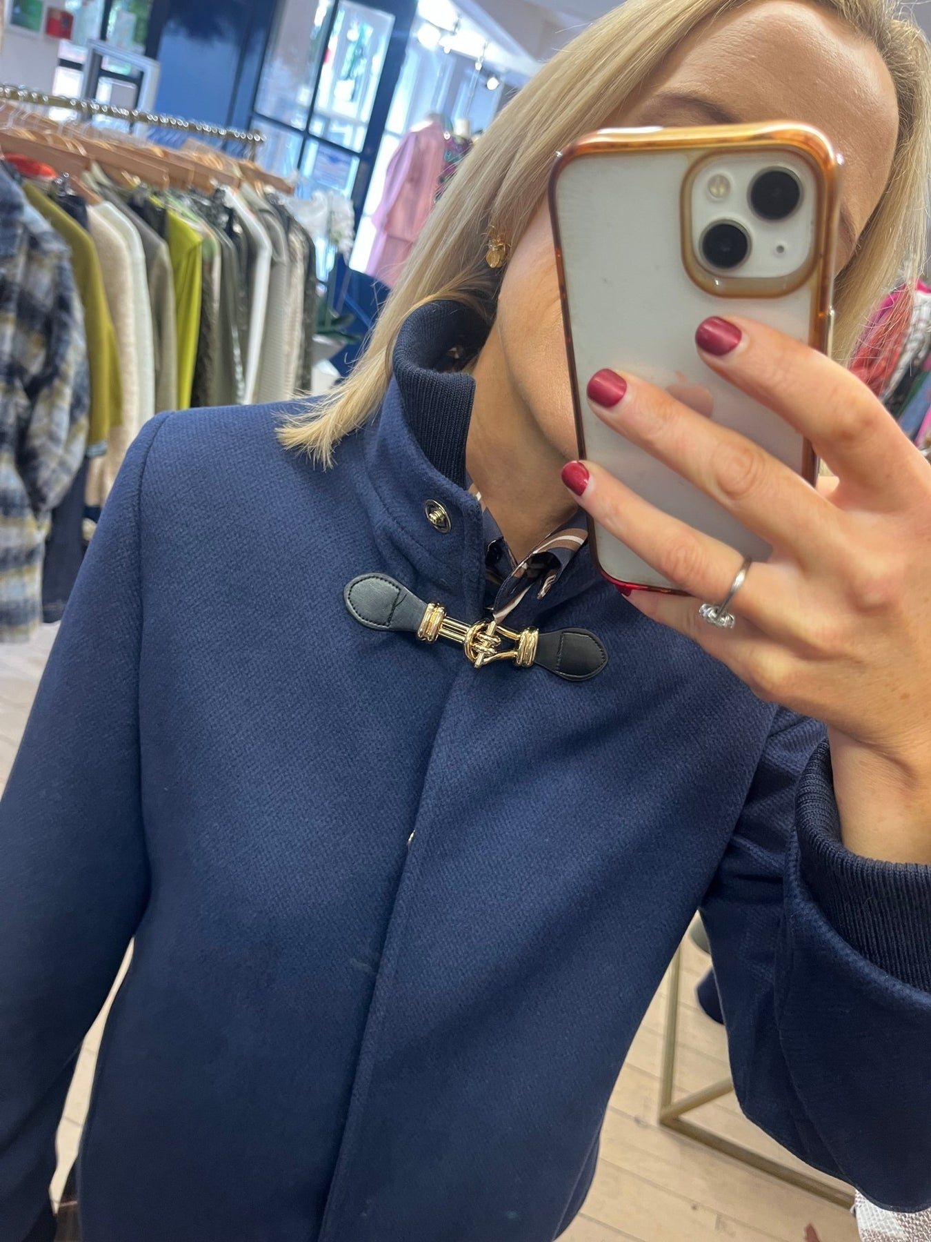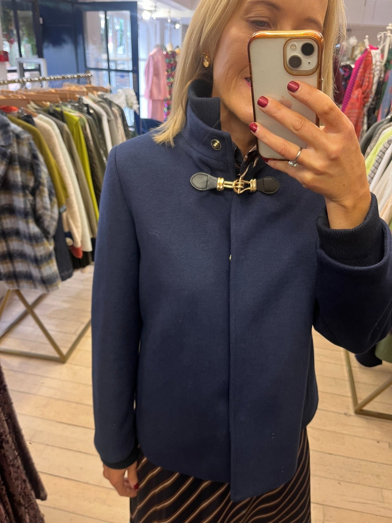 A nod to the Duffle coat this gorgeous short blue jacket by Fly girl has a contrasting material collar,stunning yet simple metal work opening to the top and two side pockets.