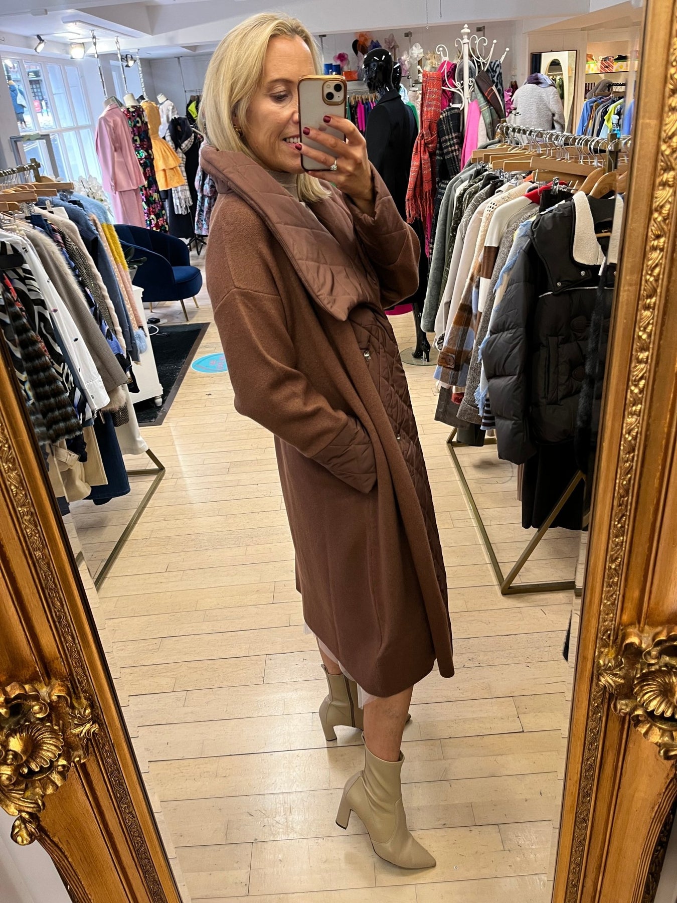 This piece is extremely soft with-oversized lapel collar and contrasting quilted edging.