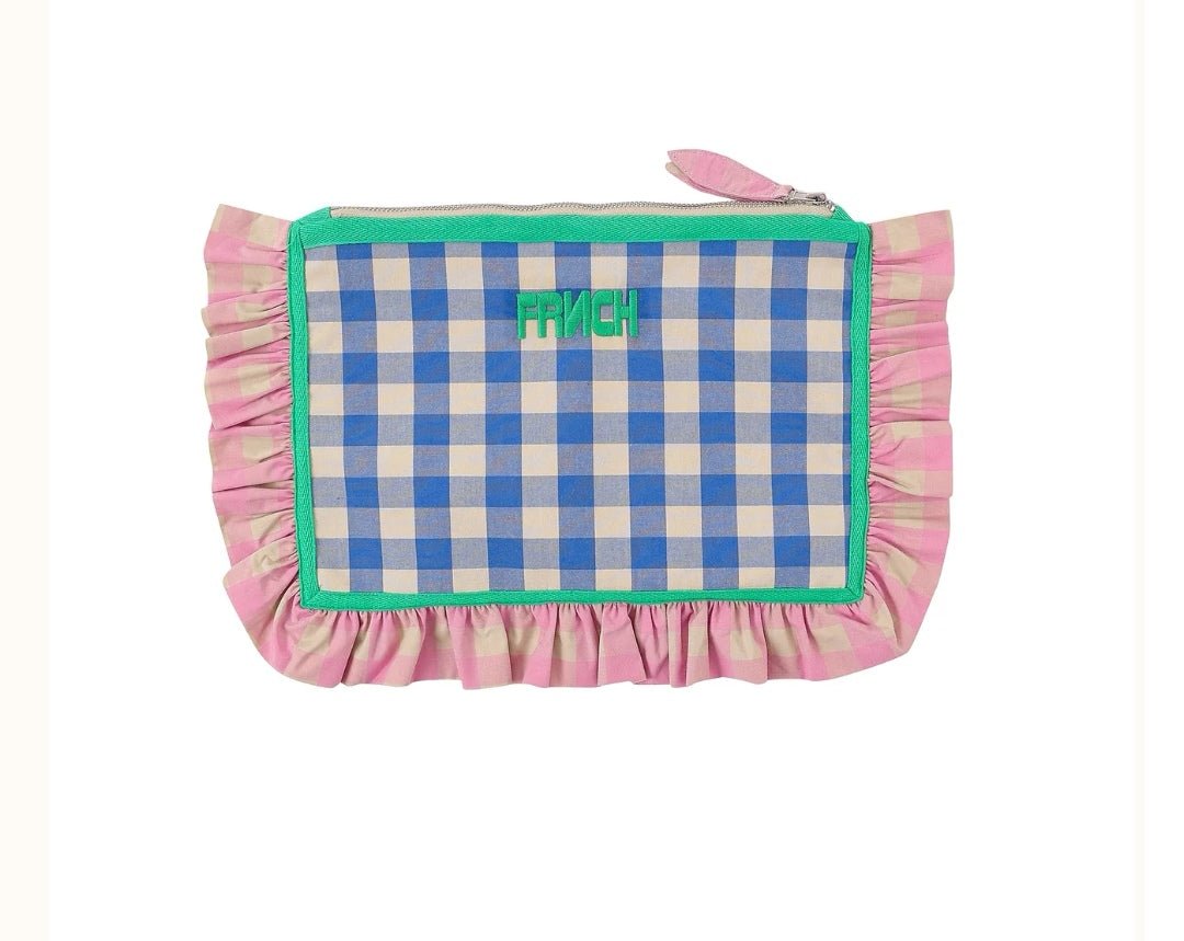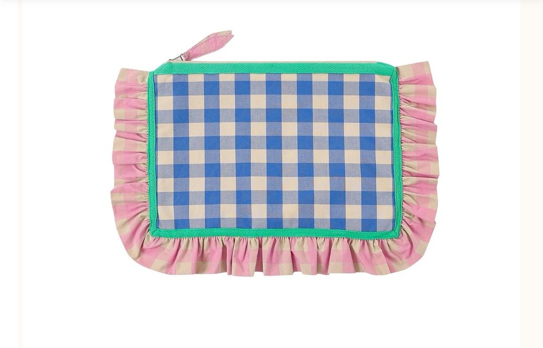 Fabric pouch with checkered pattern, gathered ruffles, and zipper closure