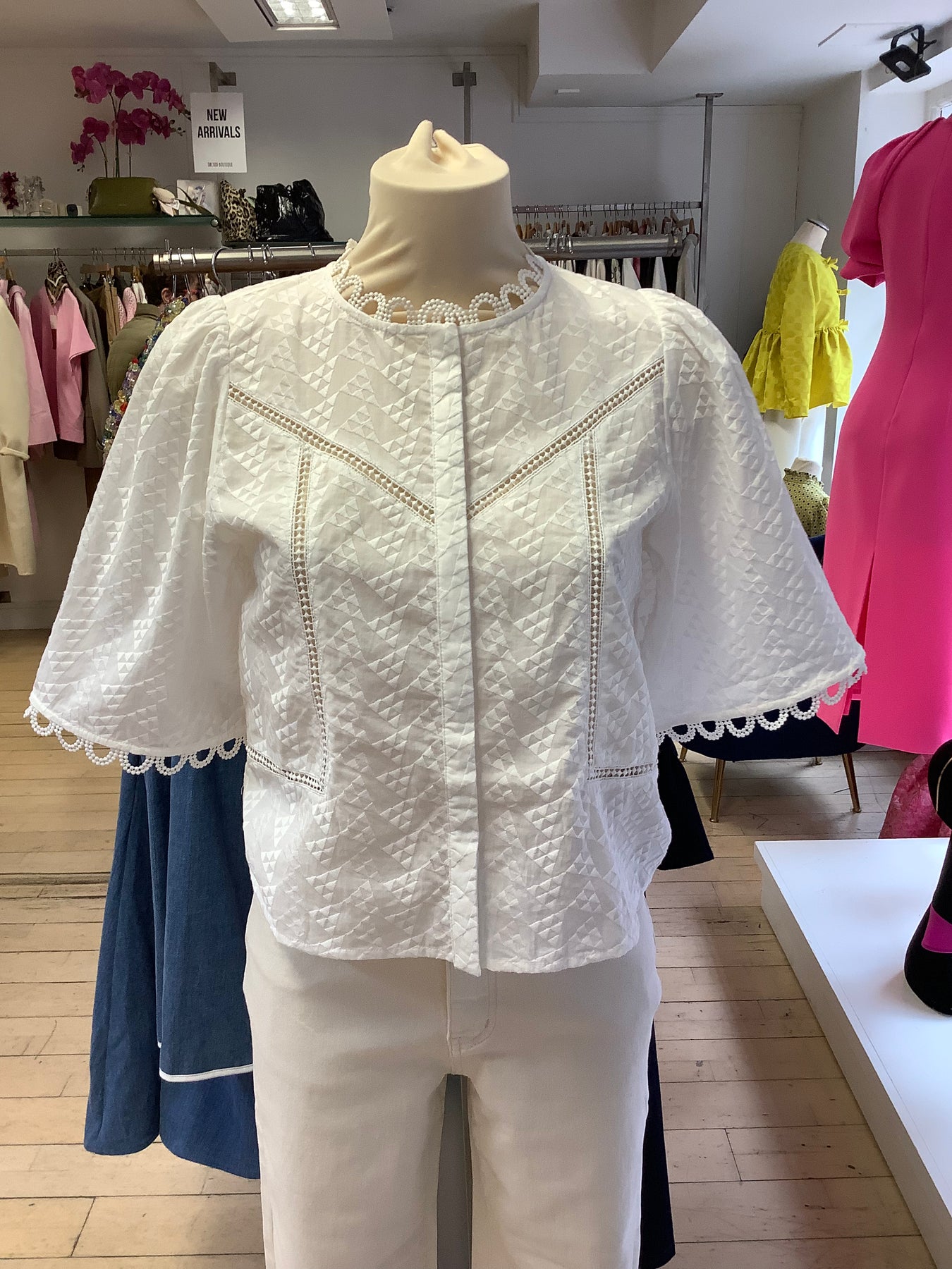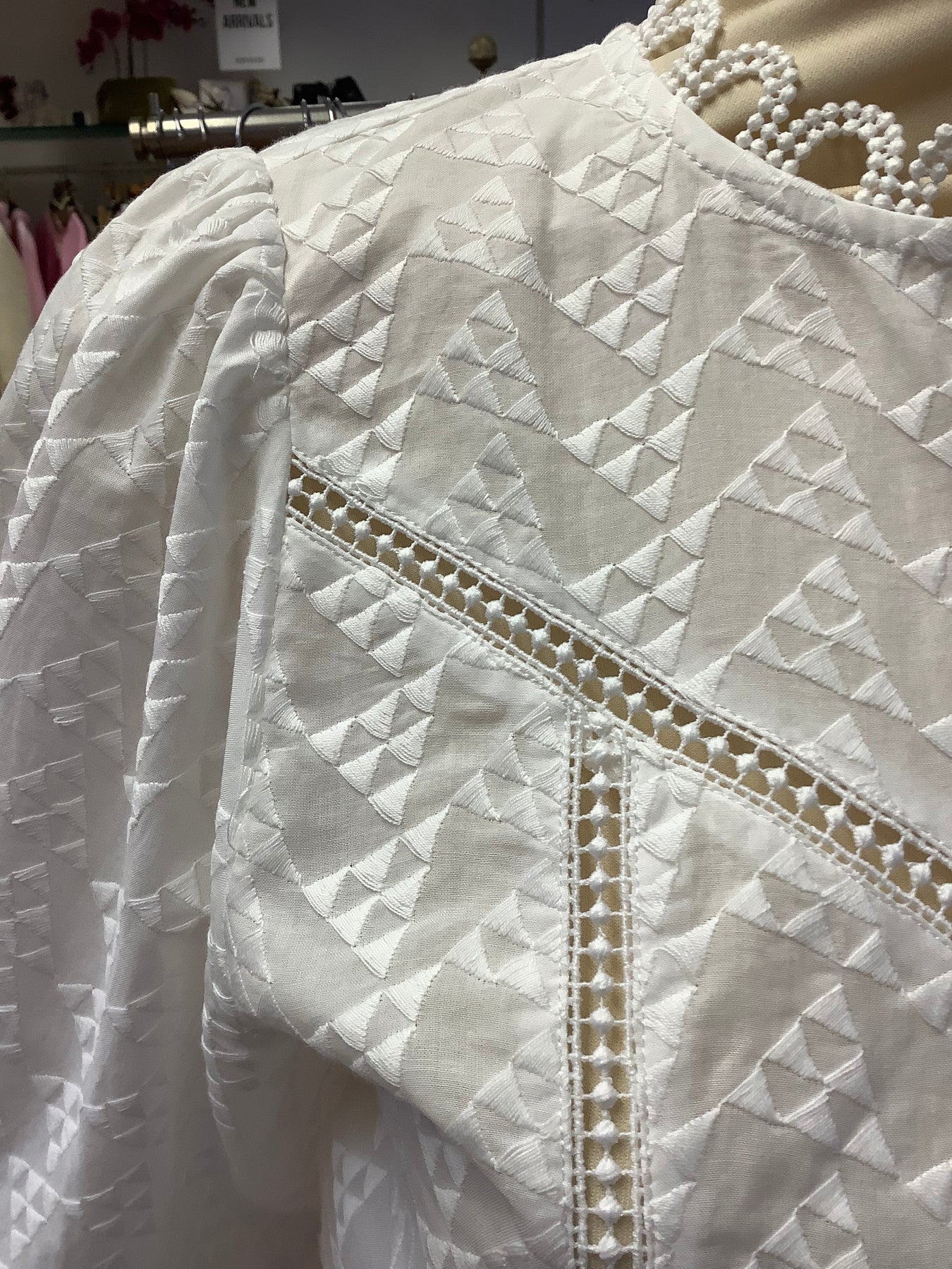 Short flared sleeves with lace loop detailing.