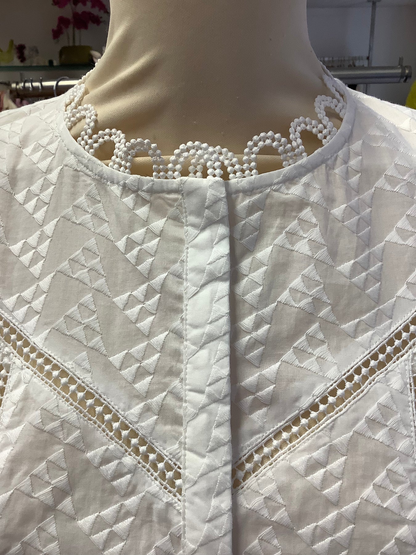 It features a round neckline with lace “loop” detailing.