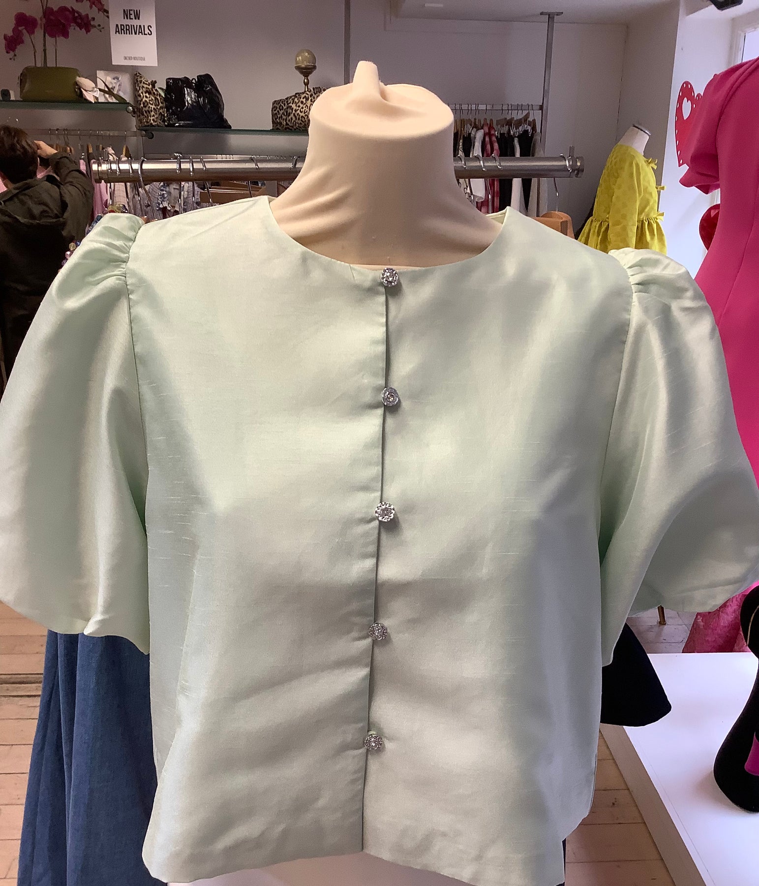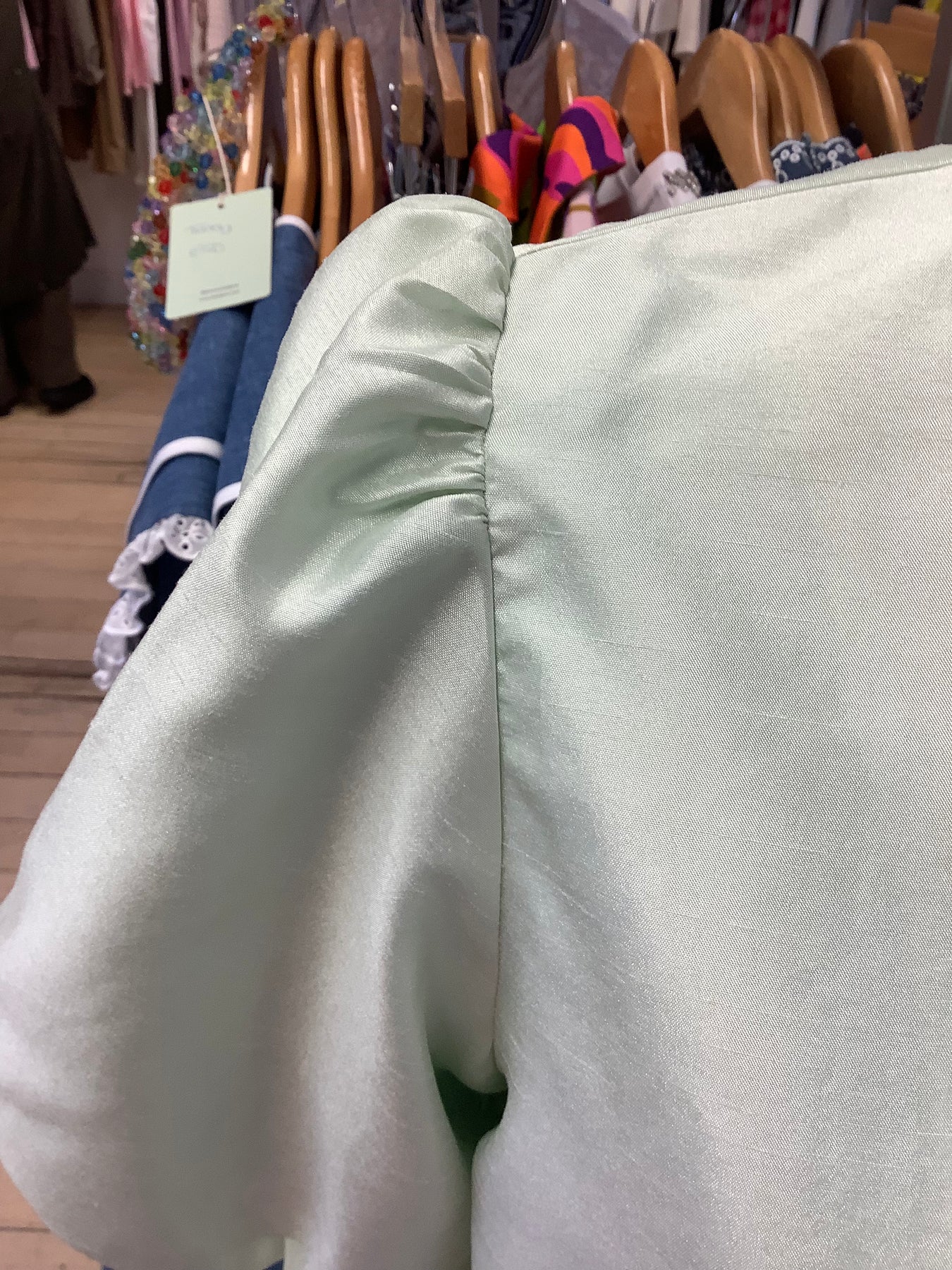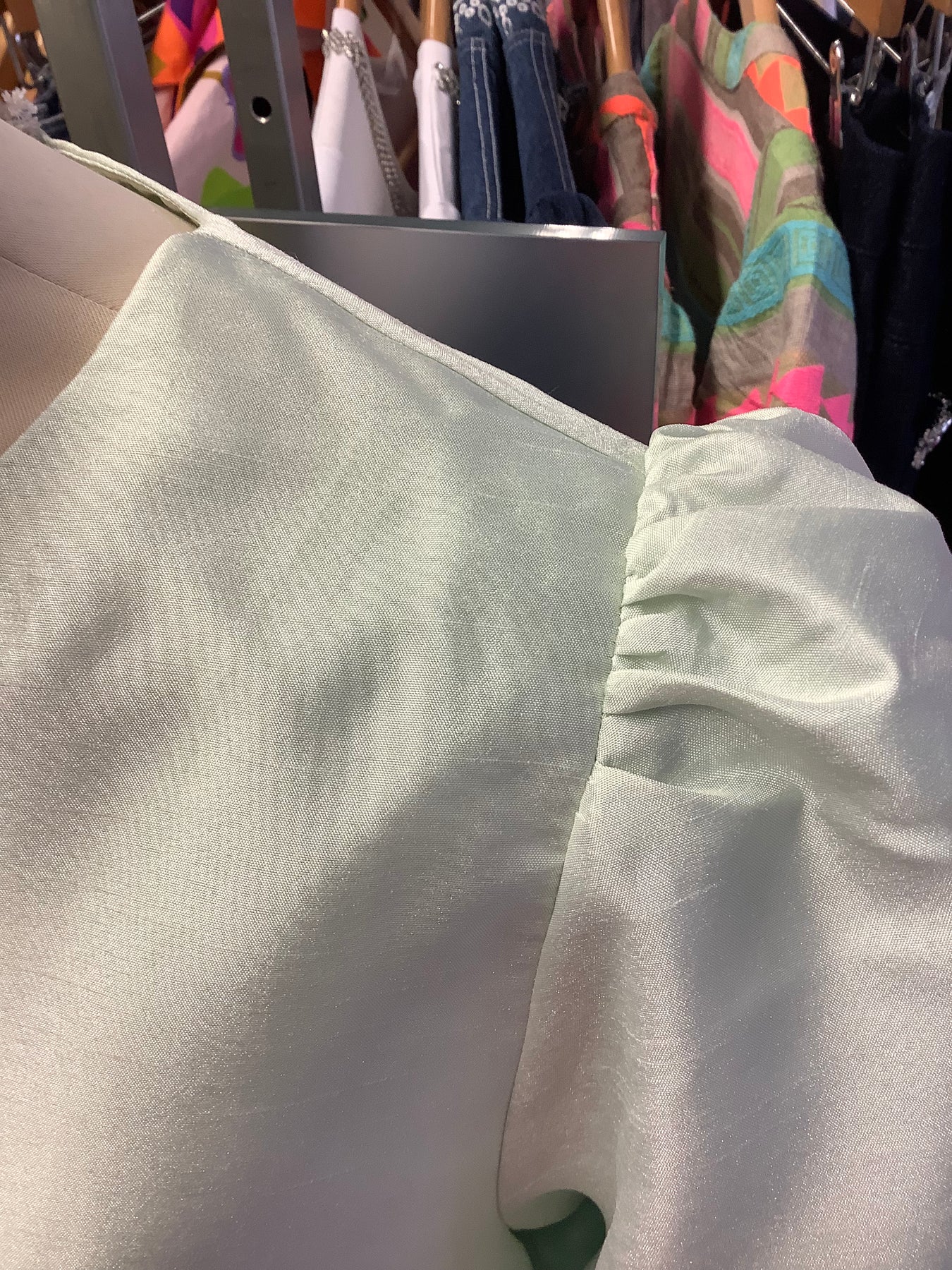 This Beautiful soft mint green blouse by Suncoo is crafted in a raw silk style fabric.