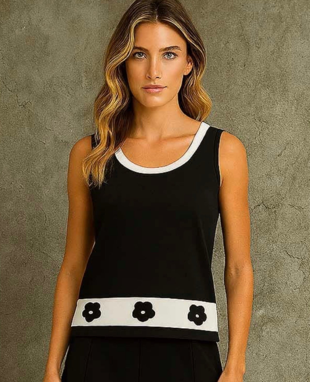 - This is a stunning silk touch, weighted jersey sleeveless top, with appliquéd flowers and contrast stripes.