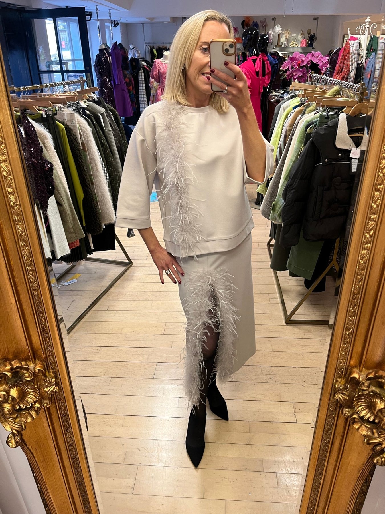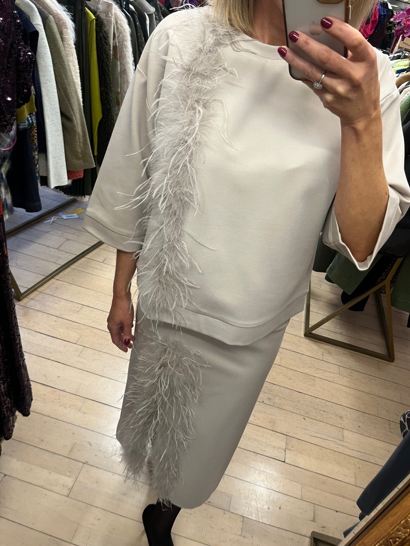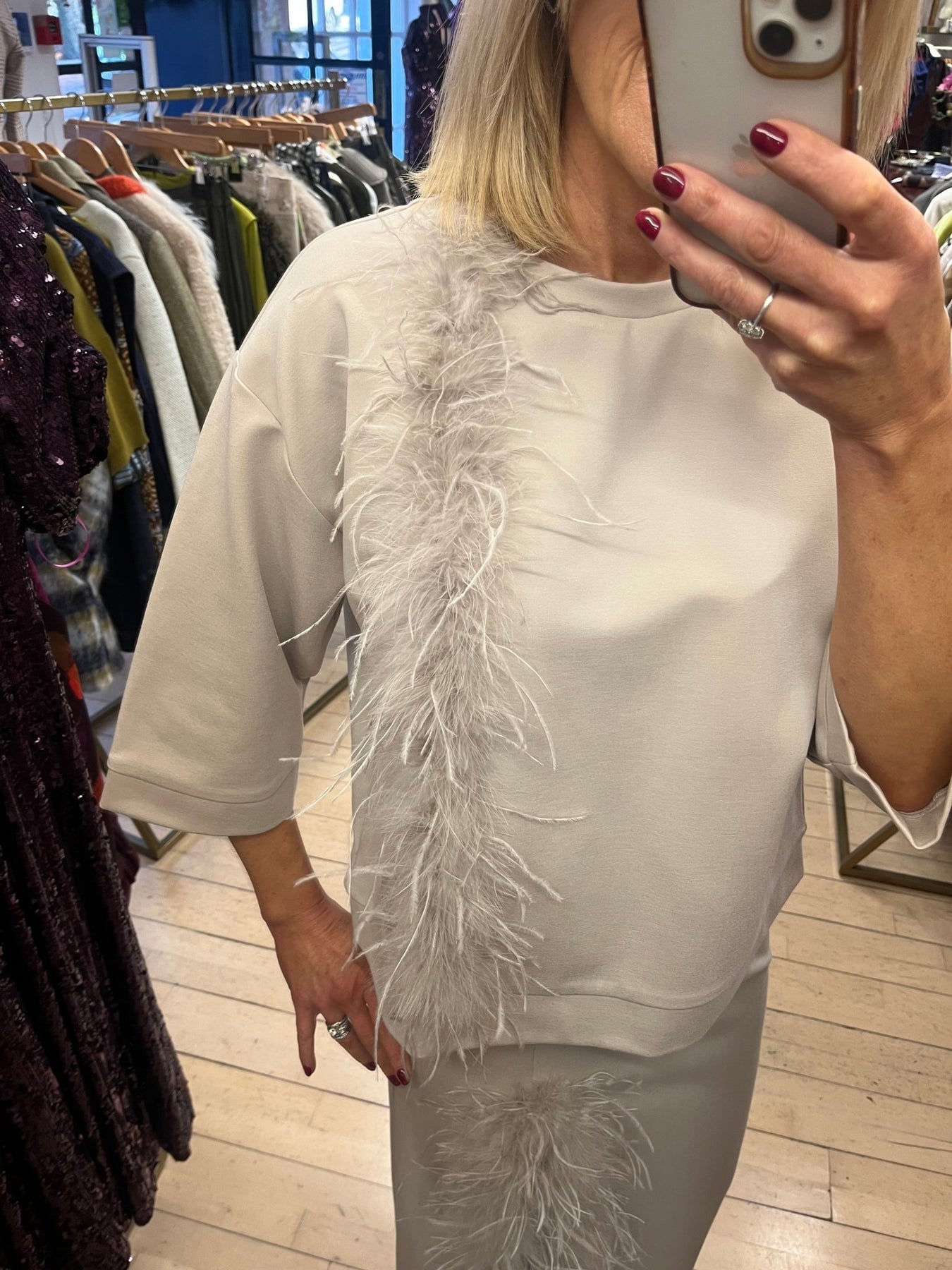 Relaxed-fit blouse with a front feather trim. Features a round neckline and wide 3/4 sleeves. Pair it with the matching skirt from our collection for standout looks.