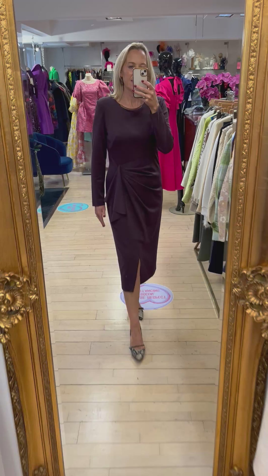 Stunning purple dress with long sleeves,round neckline with metalwork detailing and gathering to the front.