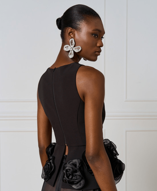 Top with organza flower details. It features a round neckline and decorative seams. Choose it for standout, glam looks.
