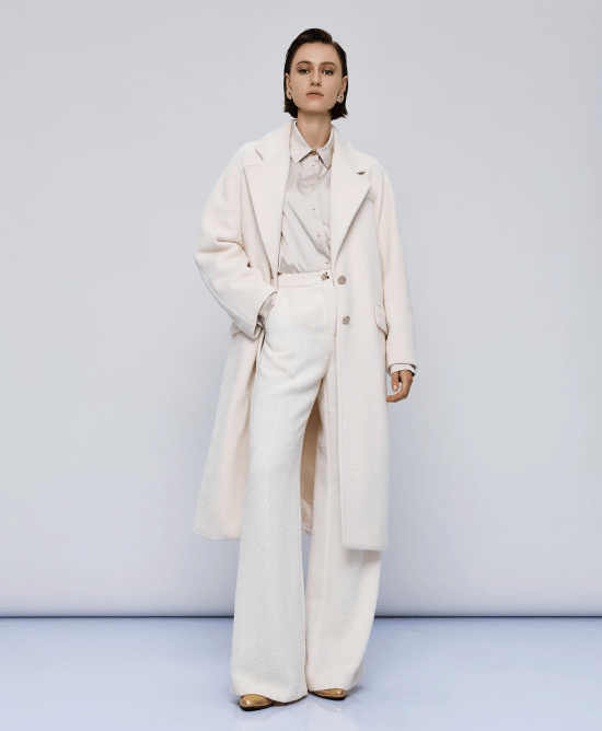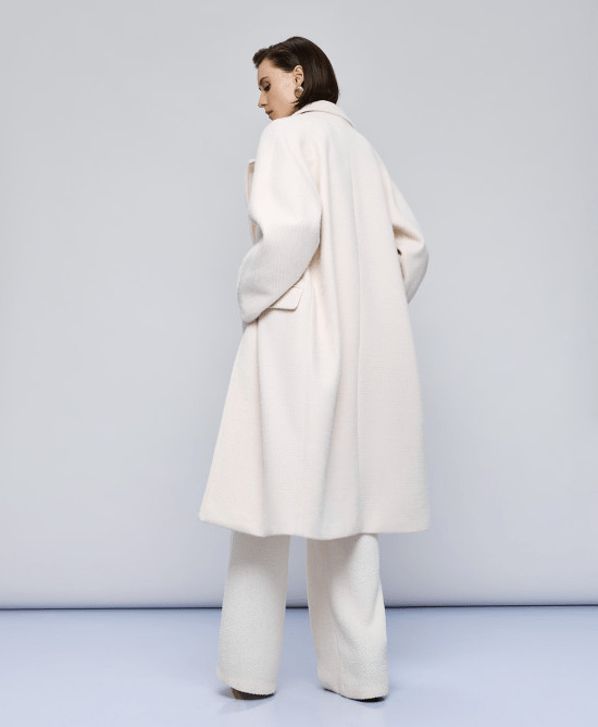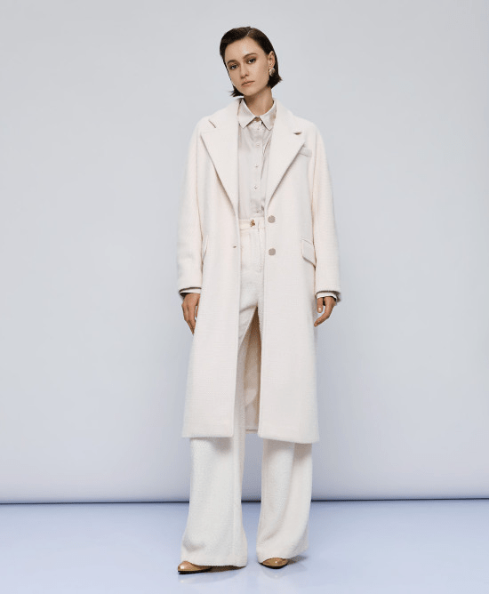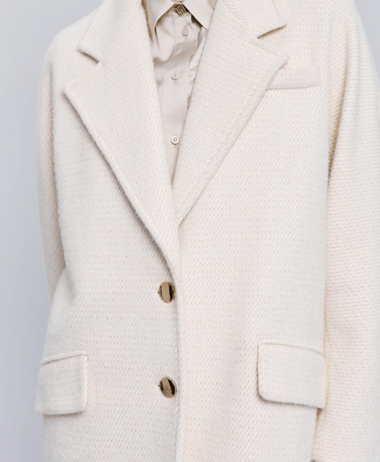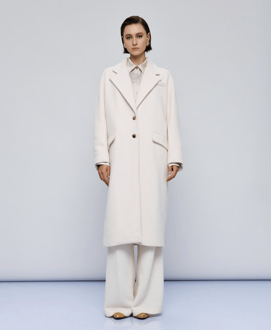 Long coat with notched lapel collar, front flap pockets and metallic button closure. It features a fluffy texture with subtle lurex details. A chic choice for stylish winter looks.