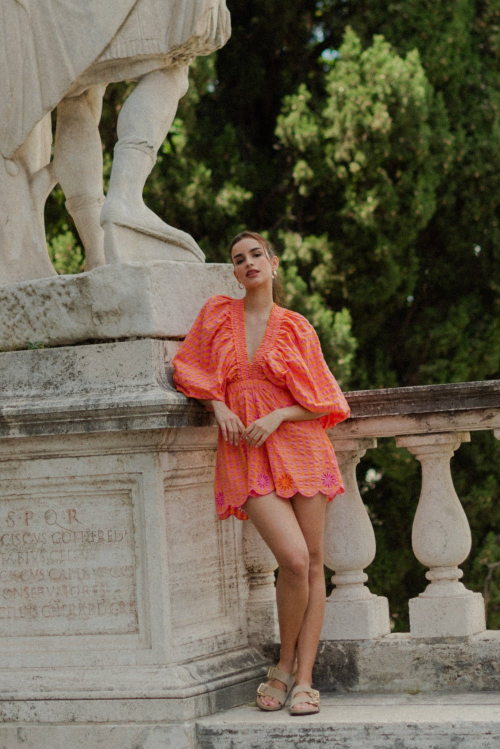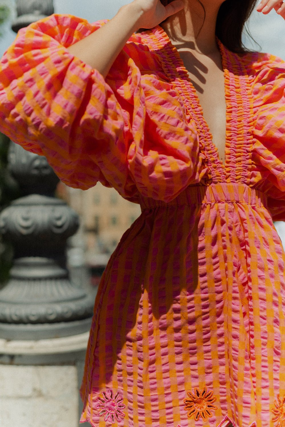 Discover our unavoidable best seller Alicia in a new backless version, Anemone, with handmade sun cut details. Anemone is a gingham jumpsuit with kimono sleeves tightened at the cuffs thanks to an elastic for more volume. Its V neckline has an elastic embellished by little gathers. An elastic allows to adjust the jumpsuit at the waist and creates a flared bottom.