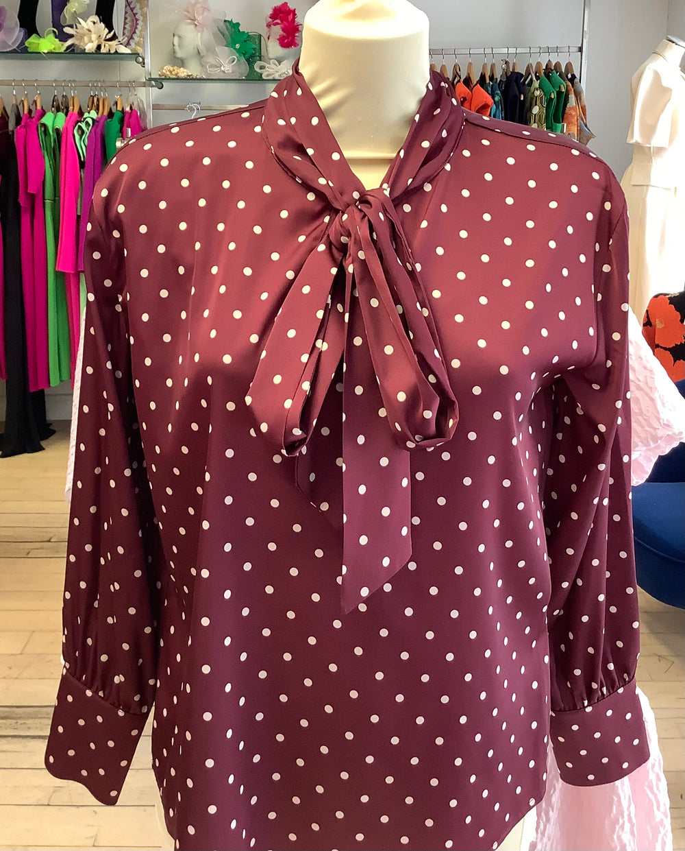 The Bordeaux Blouse by Fly Girl Italy is a gorgeous polka dot blouse with pussy bow detailing.