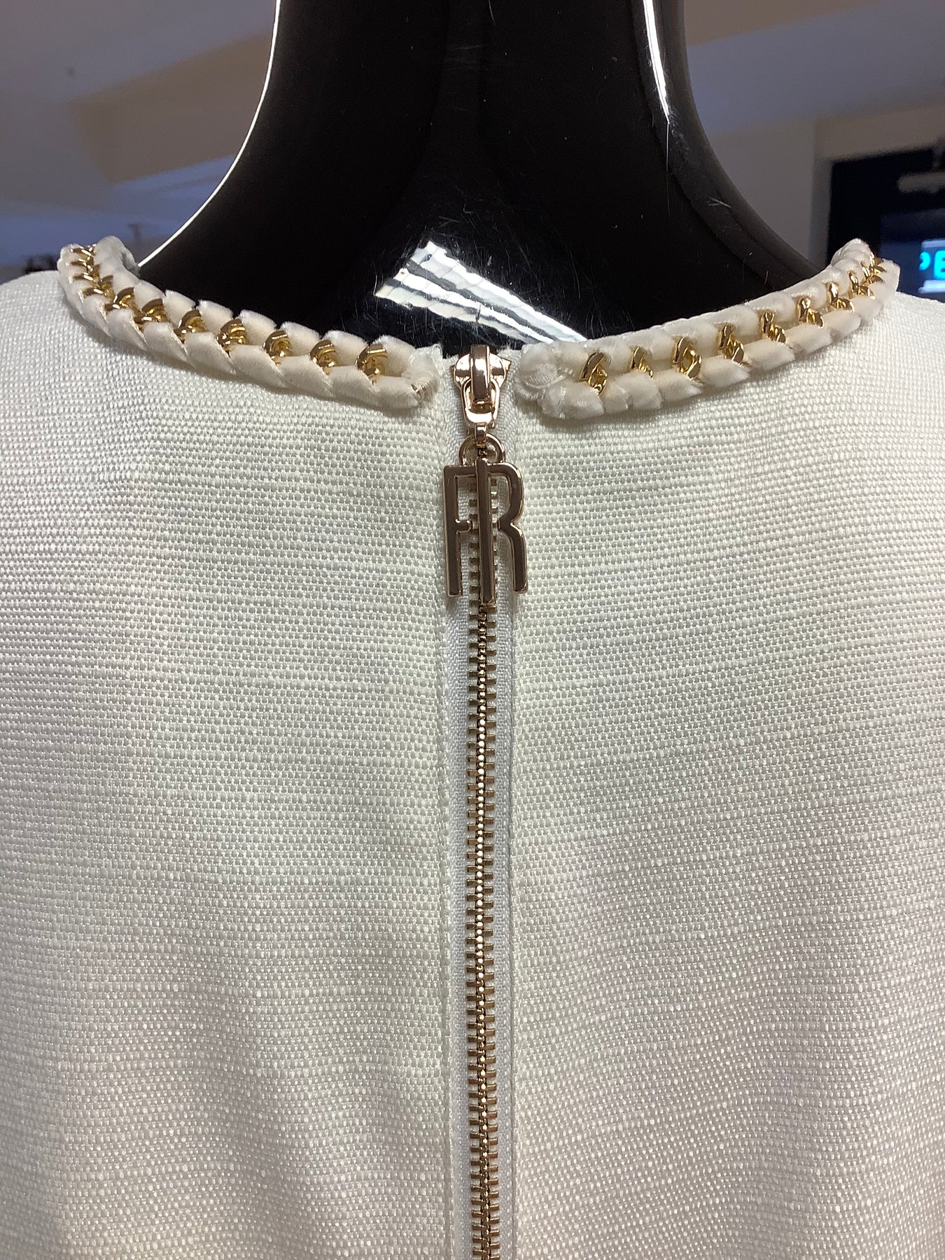This gorgeous cream short tank dress by Fracomina has a gold coloured chain link detailing interwoven with a cream velvet ribbon around the neckline and also above the hemline.