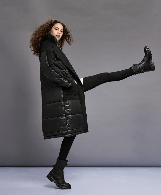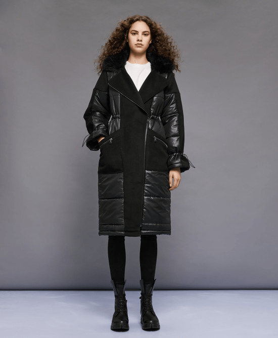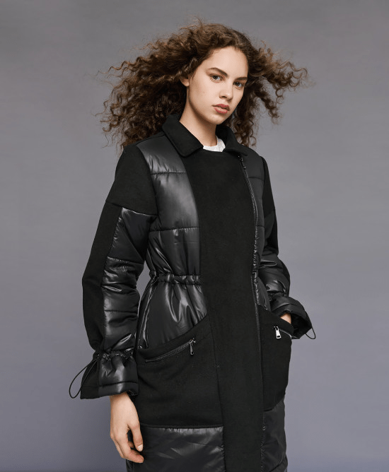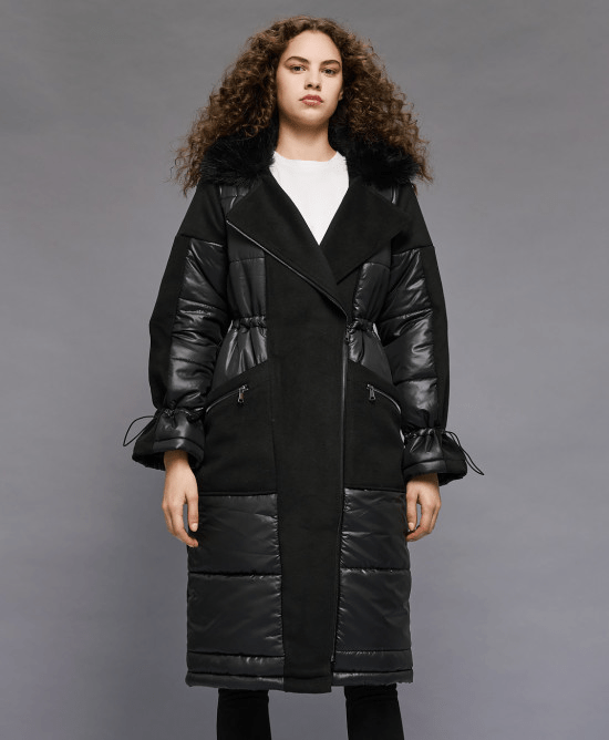 Long puffer jacket made of a fabric combination with adjustable drawstrings on the sleeves and at the waist. It features front patch pockets with decorative zips and a detachable faux fur collar. An ideal choice for elegant and warm all-day looks.