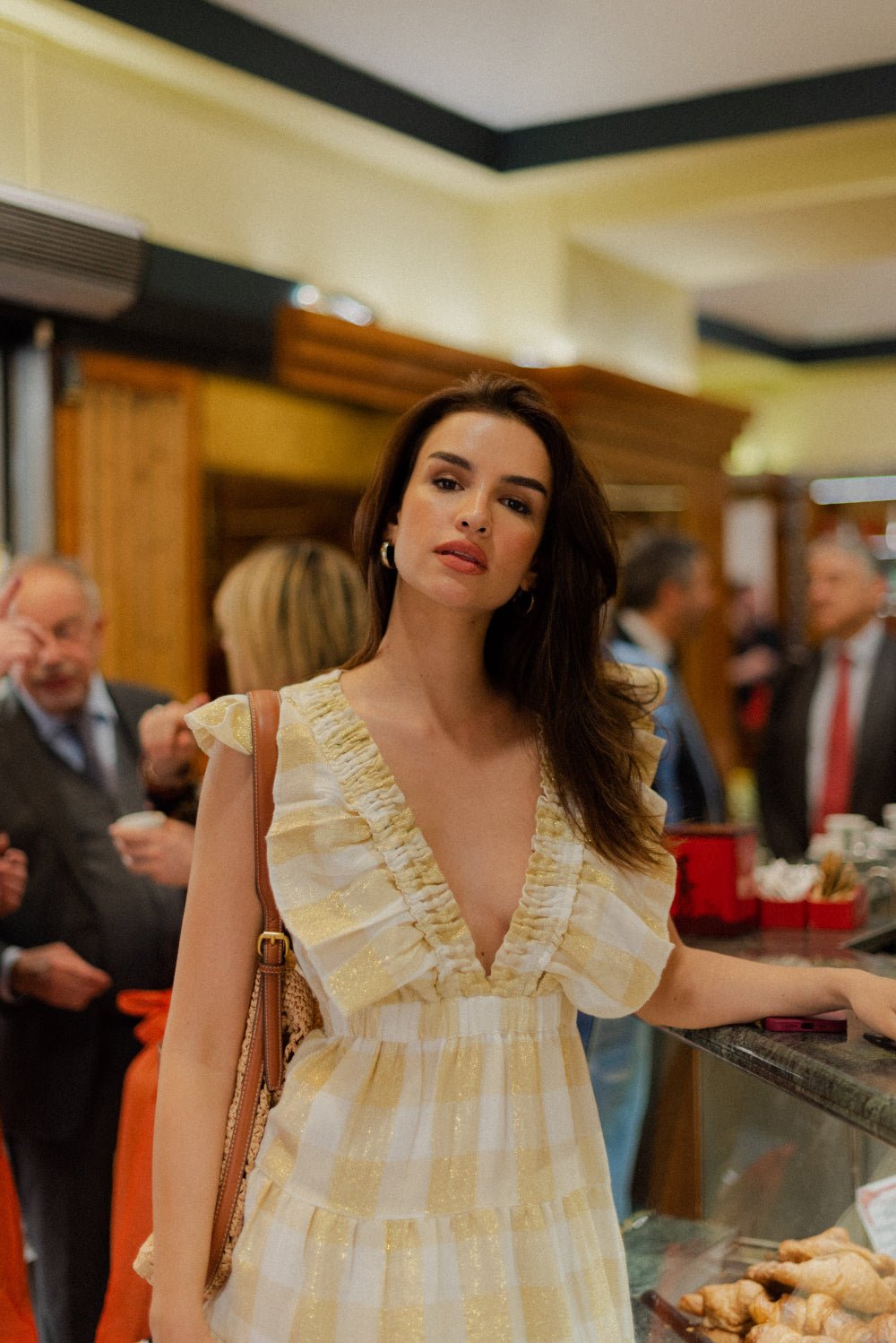 Made in a gingham fabric, Shandrani has a plunging V neckline with an elastic embellished by little gathers. Gathered flounces runds along the neckline elastic and create little and feminine sleeves. The bottom is made up of series of gathered yokes prettily adorned for an unique volume.